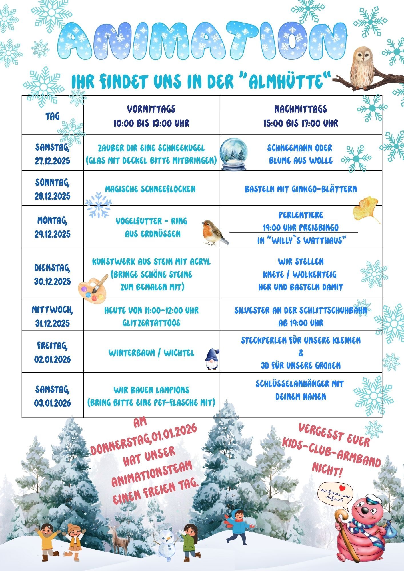 In unserer Almhütte ist was los! In den Ferienzeiten von MV und unserer Hauptsaison ist unser Animationsteam mit vielen kreativen Ideen für kleine und große Camper da!